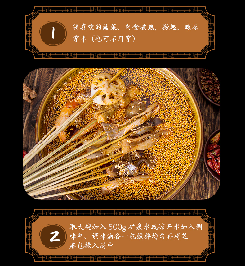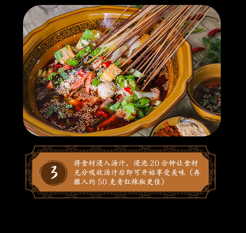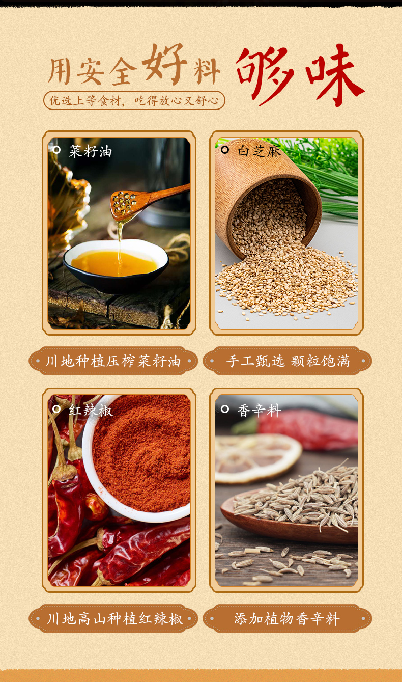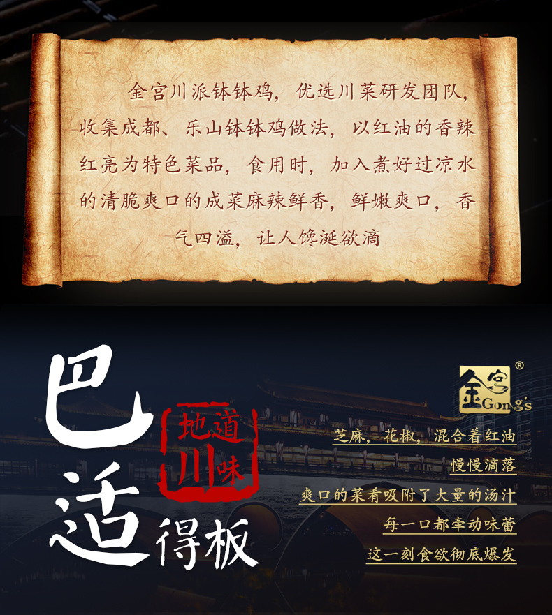 產品簡介:本調料是金宮川派公司川菜研發團隊收集成都、樂山缽缽雞的做法,以紅油的香辣紅亮為特色,成菜麻辣鮮香,鮮嫩爽口,香氣四溢,讓人饞涎欲滴。