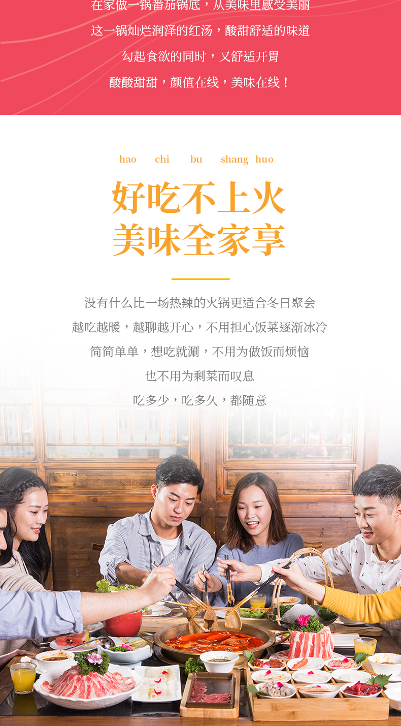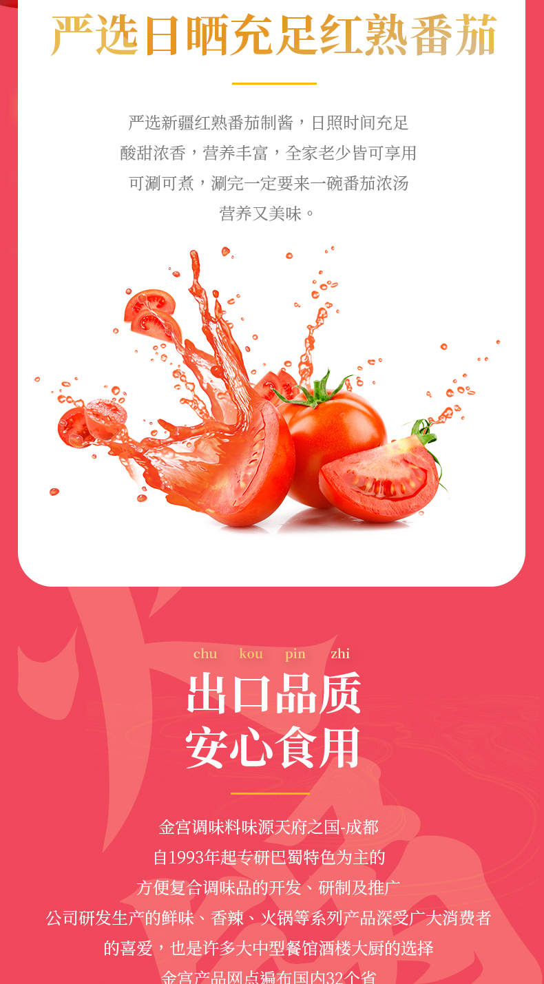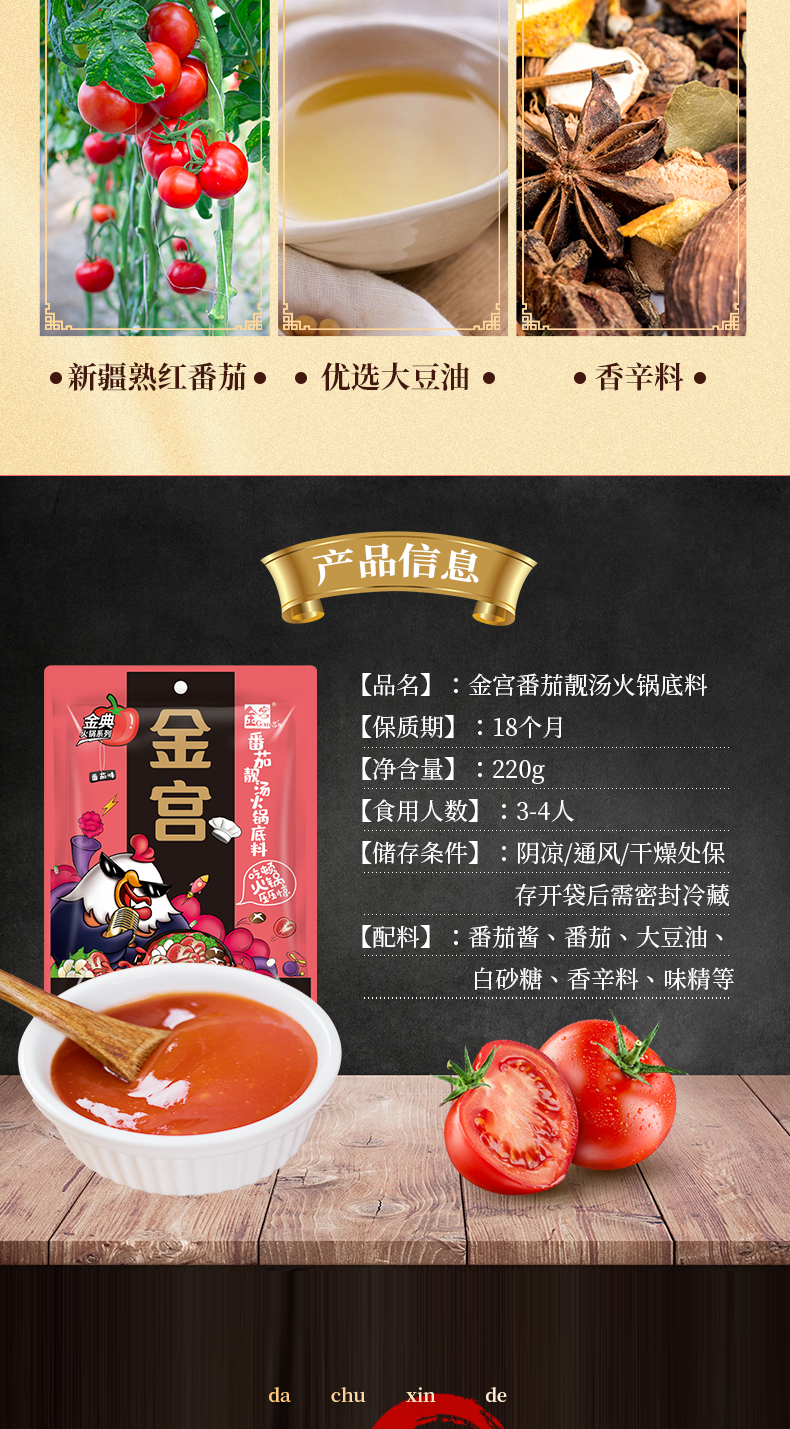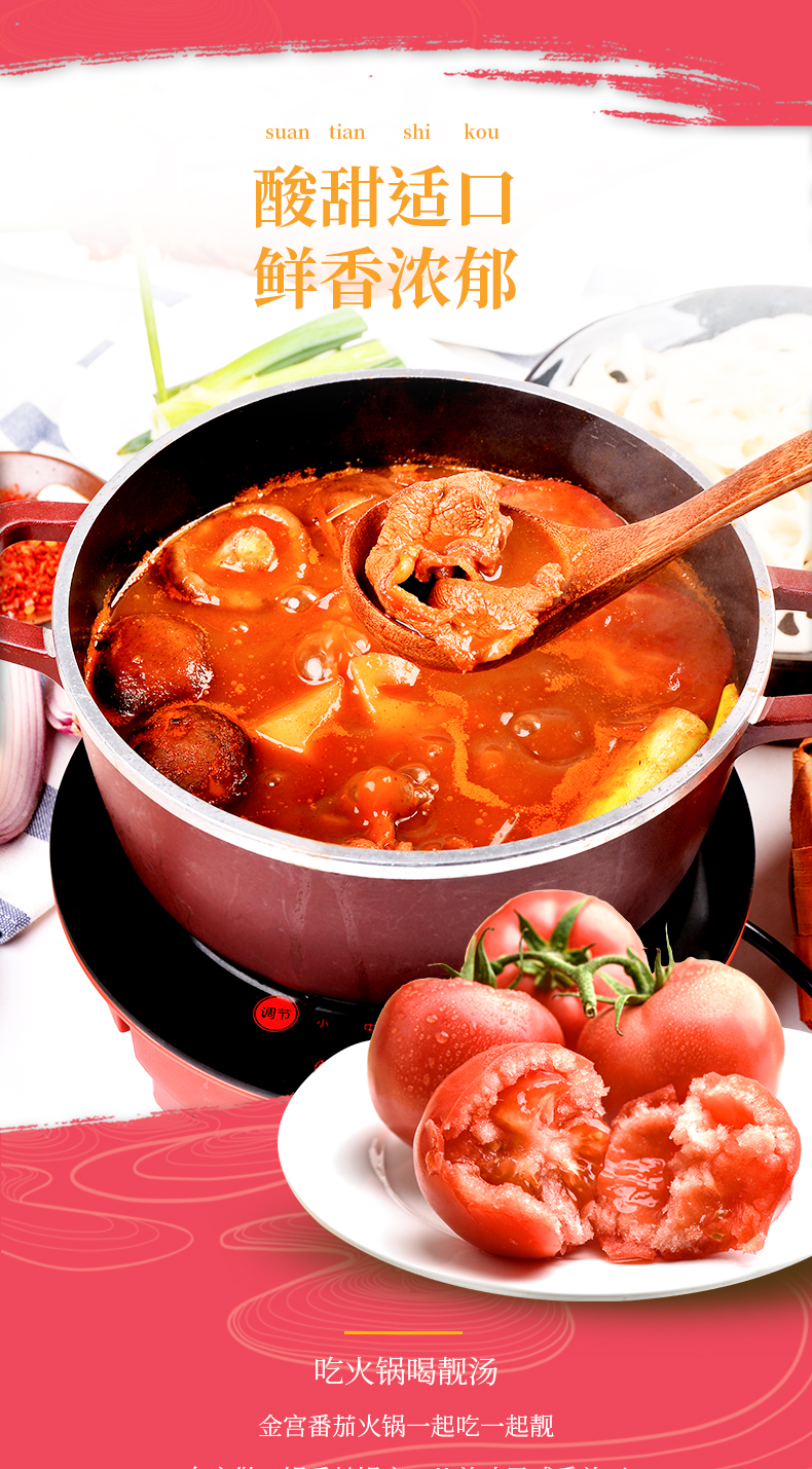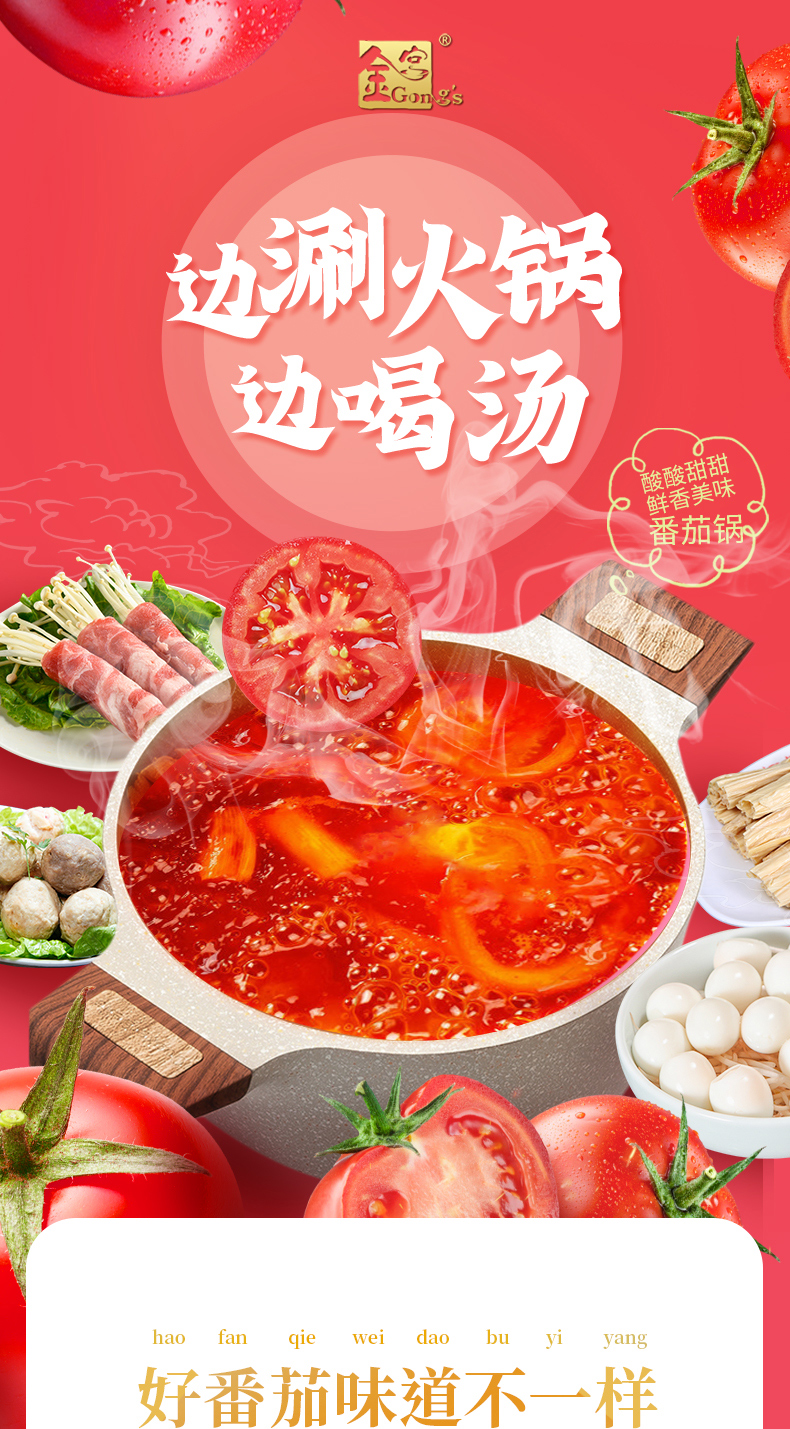 產(chǎn)品簡(jiǎn)介:金宮番茄火鍋底料是金宮川派公司研發(fā),精選植物油、番茄、香辛料等精制濃縮而成,顏色紅亮潤(rùn)澤,酸酸甜甜,番茄香濃,番茄靚湯火鍋底料清新開(kāi)胃、鮮味適口。
