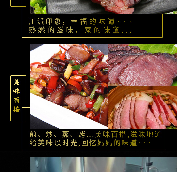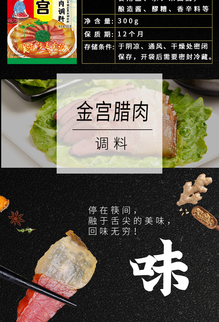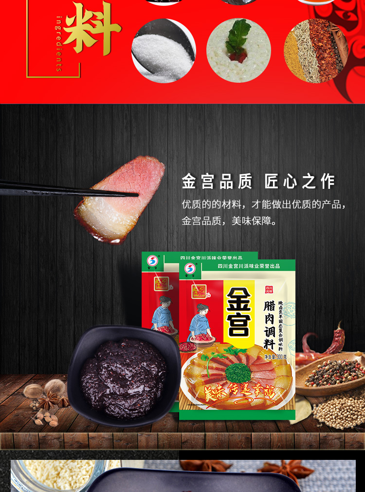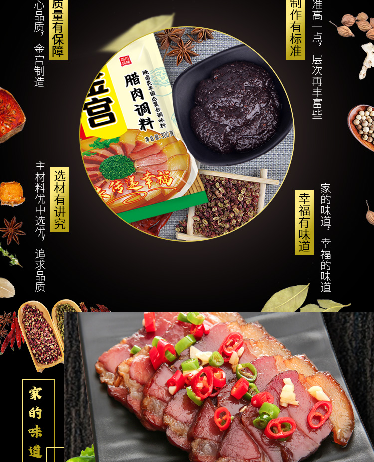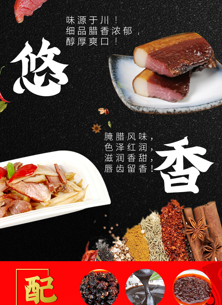 產品簡介:本品精選多種四川本地優質原料,用本調料制作的臘肉充分體現了香味濃郁、肥而不膩、瘦而不柴、滋味鮮美的特點,是家庭、食堂、餐廳制作四川臘肉的上乘調料。