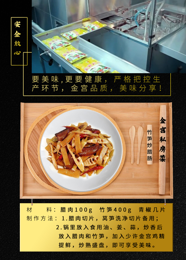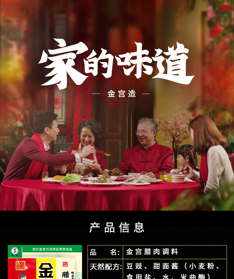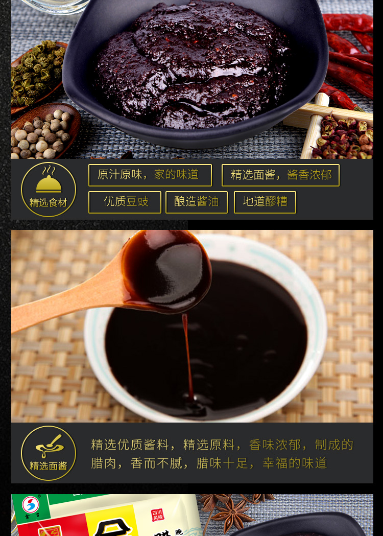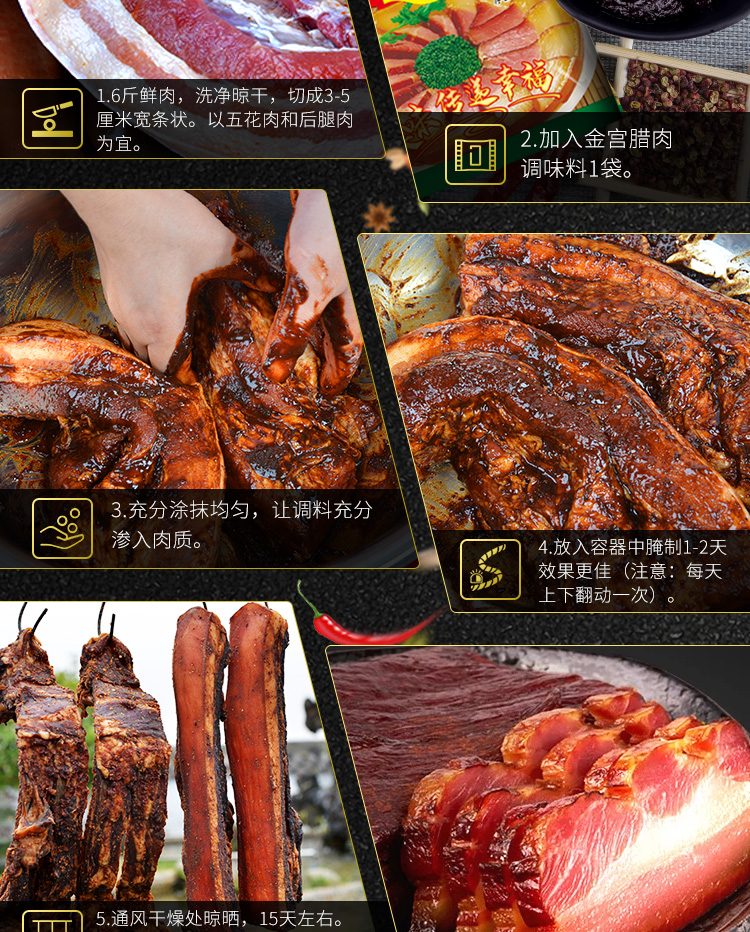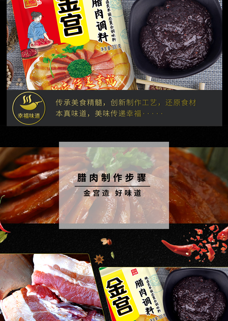 產品簡介:本品精選多種四川本地優質原料,用本調料制作的臘肉充分體現了香味濃郁、肥而不膩、瘦而不柴、滋味鮮美的特點,是家庭、食堂、餐廳制作四川臘肉的上乘調料。